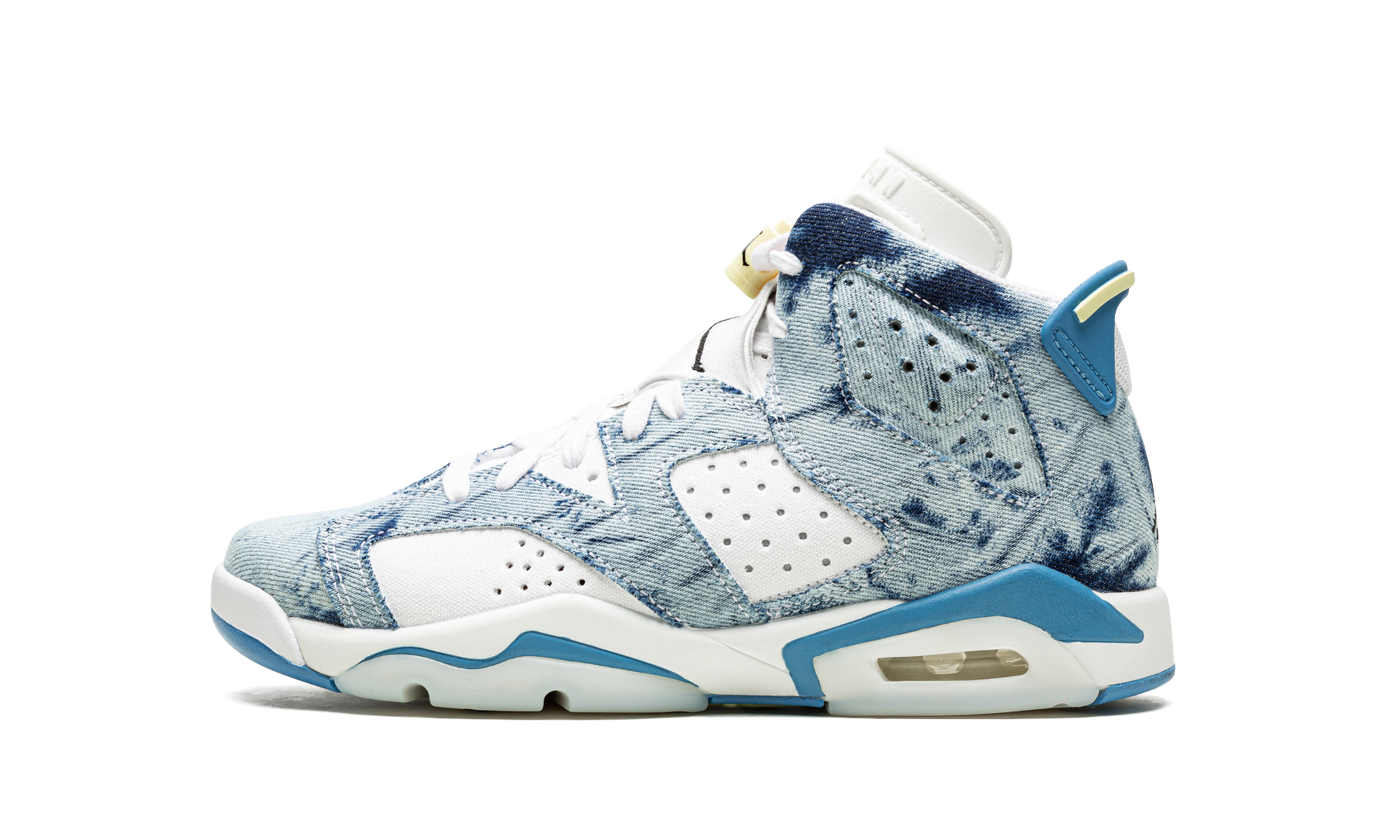 The Air Jordan 6 GS “Washed Denim” is kid’s-exclusive colorway of Michael Jordan’s sixth signature shoe with a trippy, acid wash denim on its design. The “Washed Denim” Jordan 6 GS features a white leather base with colorful contrasting washed denim overlay panels. A black Jumpman logo is embroidered on the heel above classic “Air” branding. An additional black embroidered Jumpman is found on the white neoprene lace overlay. Lime Green accents the rear heel spoiler. The visible Air unit in the heel is bordered by light blue paneling, which completes the look. Release date: May 15, 2022