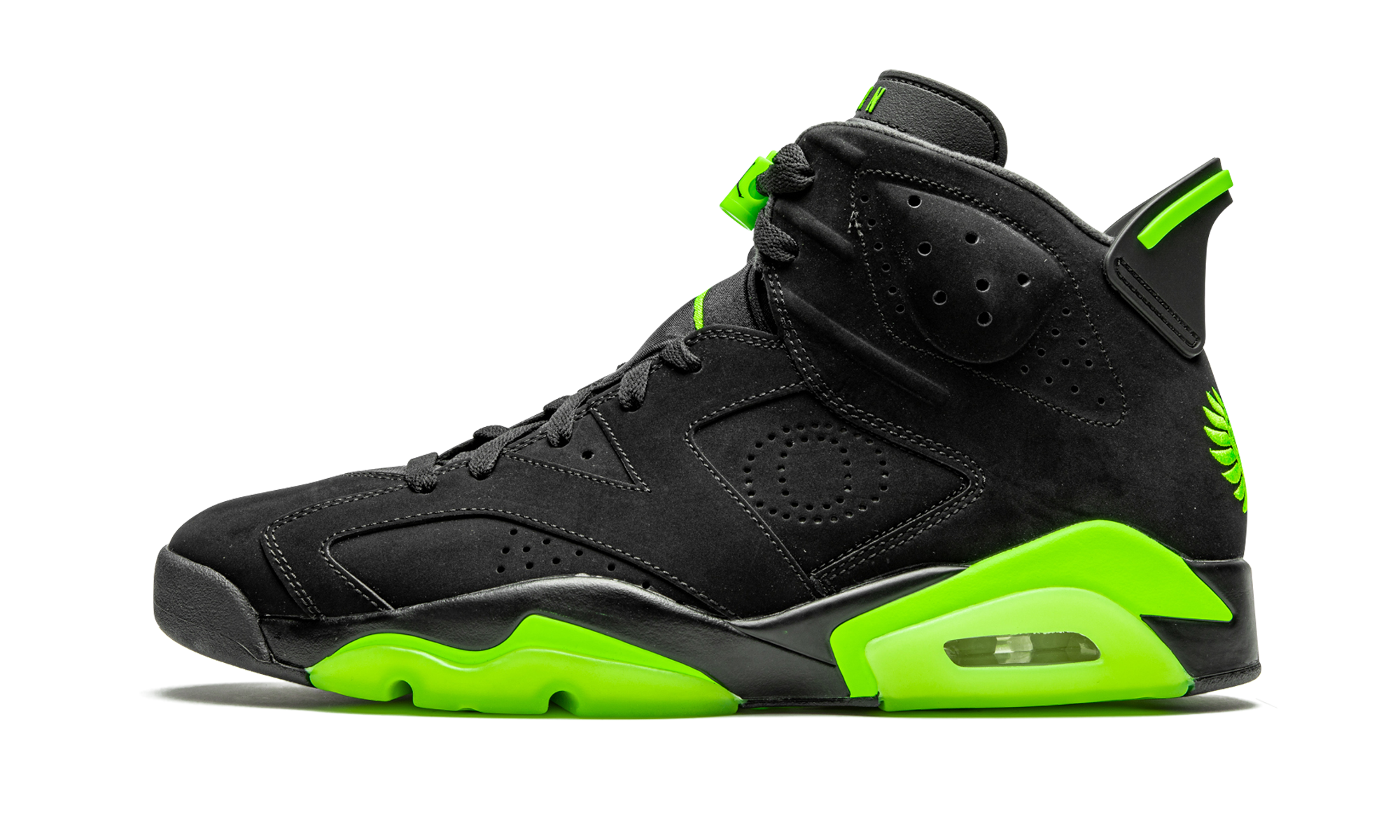 The Air Jordan 6 “Oregon Ducks PE” is a highly desirable, limited edition colorway given to student athletes on the Oregon Ducks sports teams. Unreleased to the general public, this Jordan 6 “Oregon Ducks PE” is one of several imaginative Air Jordans created exclusively for the Oregon Ducks. The upper features a black nubuck construction. Tonal overlays can be found on the forefoot, mid-panel, and heel. Contrasting neon green accents dot the Jumpman on the black nylon tongue, the lace lock, spoiler, and “Air Jordan” branding on the tongue. Additionally, specially perforated “O” logos can be found on either side and the Ducks’ “Wings” logo is embroidered on the heel.
