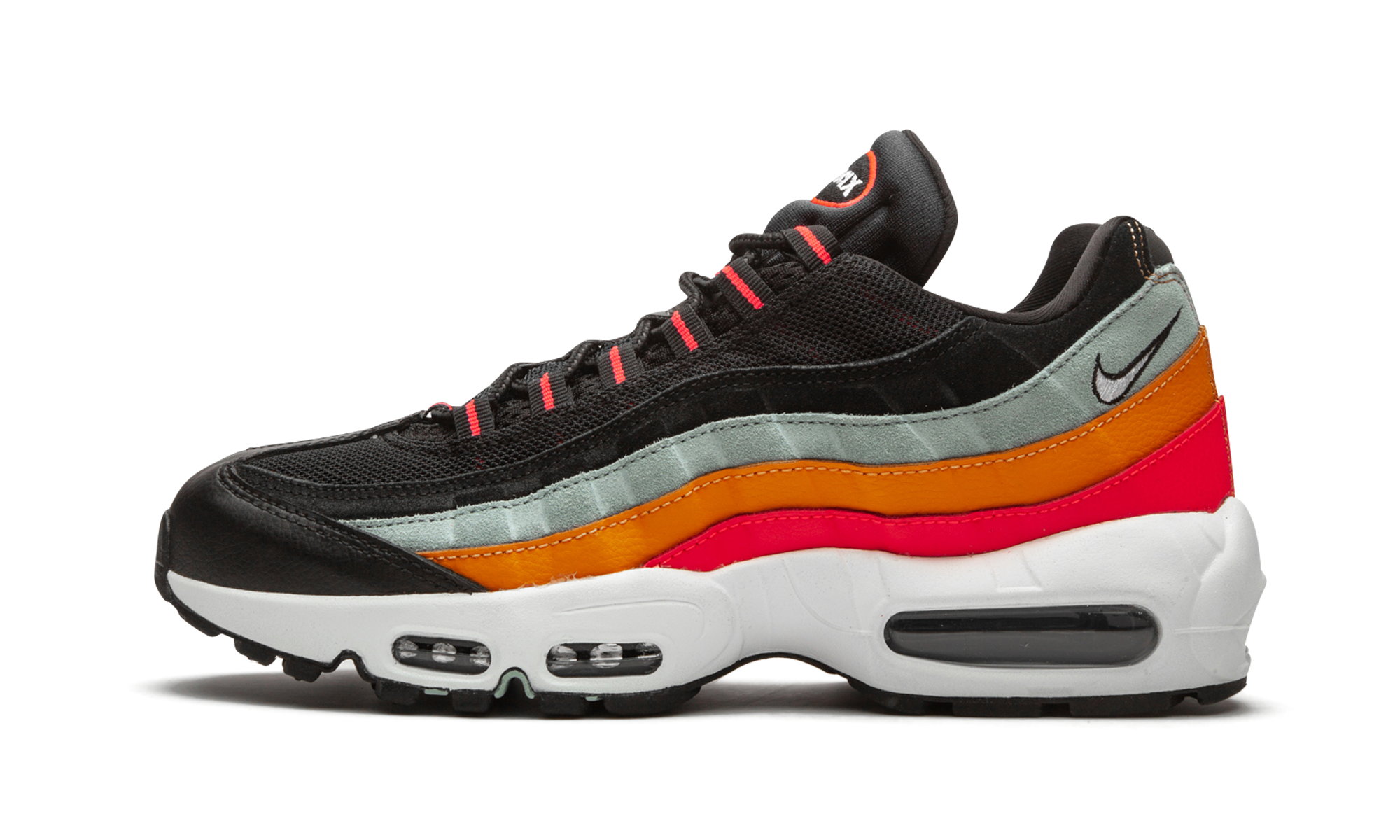 The Nike Air Max 95 Essential "Ocean Cube" brings the perfect storm of colors to accent this black and white silhouette. The top half of the upper is created with straightforward black mesh, suede, and leather. Then, a trifecta of bold colors grace the bottom layers in shades of cool blue suede, then bright orange and hot crimson red leather. The iconic "Air Max" symbol is embedded on the tongue. Incredibly comfortable, it has plenty of Nike Air cushioning throughout the white-colored midsole. The shoe is finished with black-shaded Air bubbles and a coordinating black outsole.