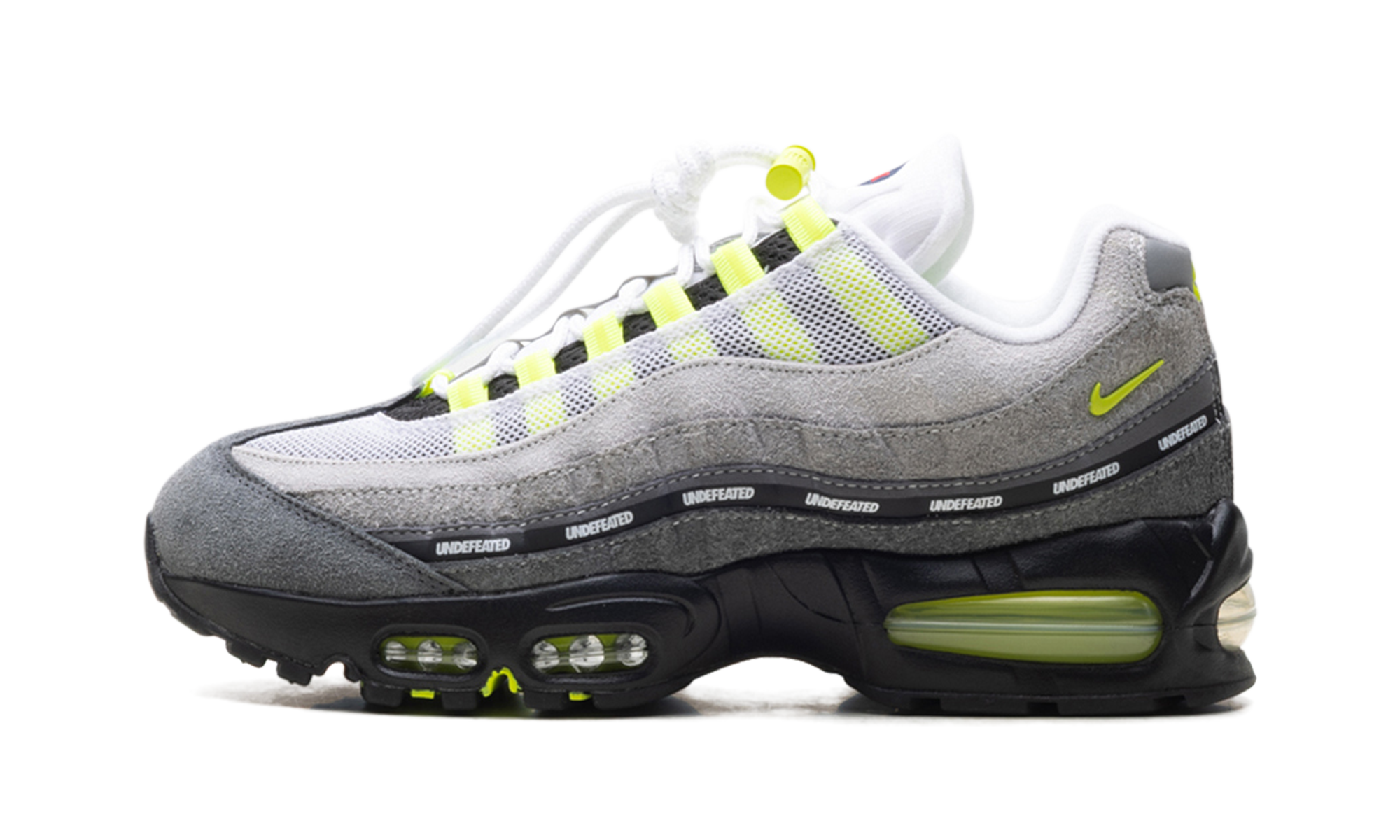 The Air Max 95 "UNDFTD - Neon" reimagines the most famous colorway in the model’s history through the lens of West Coast streetwear royalty. This Undefeated collaboration features the classic gradient grey side panels, electrified by hits of "Volt" on the Air units and eyelets. Custom Undefeated branding runs along the side stripes, signifying the elite status of this partnership. It is a powerful fusion of OG running heritage and modern street culture, celebrating 30 years of the Air Max 95.